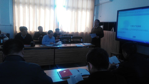 行政党支部书记李卓慧、教学党支部书记曹志斌分别向两个支部介绍了本次活动的内容及意义。按照市委组织部规定,与会党员重温入党誓词,集中学习了新《党章》的总纲部分内容。