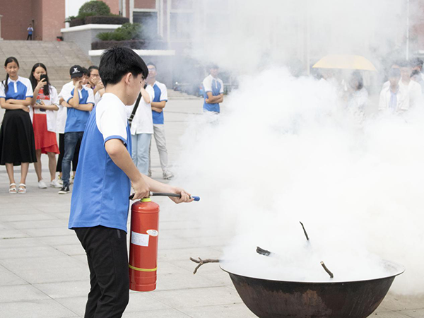 报告厅的讲解结束之后,大家来到科技楼前广场,兰教官向大家介绍了灭火器的工作原理,并通过灭火器将提、拉、握、压等操作步骤进行了详细的讲解与演示。为了使师生提高实际操作能力,还特意安排了教师代表和学生代表进行了灭火演练。
