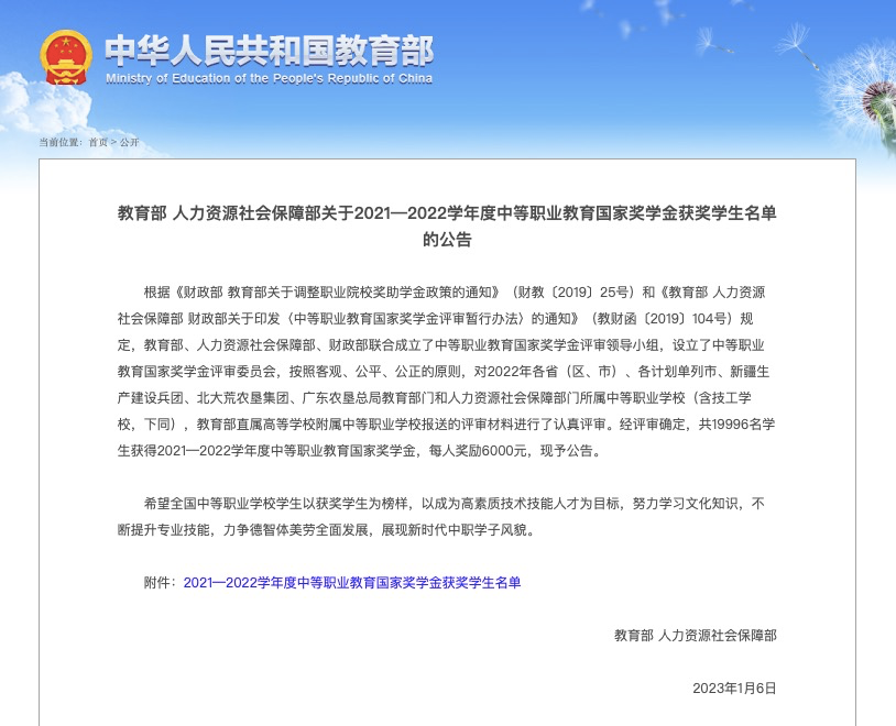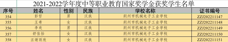 近日,教育部、人社部公布2021-2022学年度中等职业教育国家奖学金荣获者名单,我校彭哲、王希、李欢、舒佳怡、汪谢雨欣五位同学通过层层选拔,荣获2021-2022学年度国家奖学金。