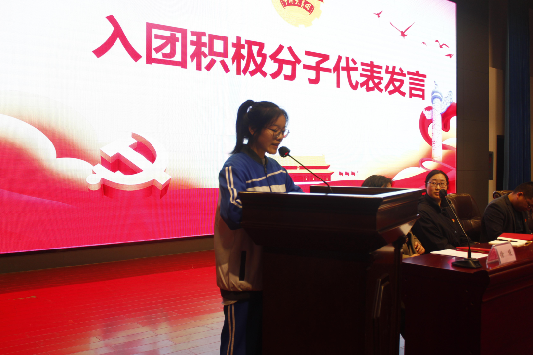 2023班胡蝶同学代表全体学员进行了表态发言,从责任和义务、使命与担当等方面代表全体学员表了决心,希望全体学员在今后的学习和生活中更加严格要求自己,锤炼品德修养,争取早日成为一名合格的共青团员。