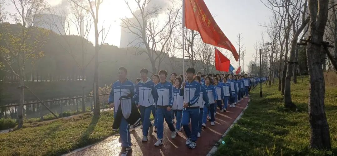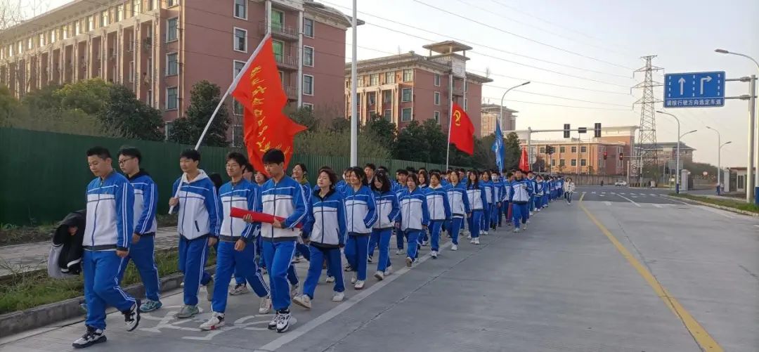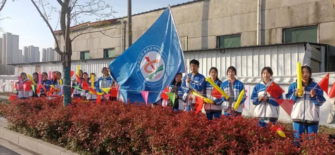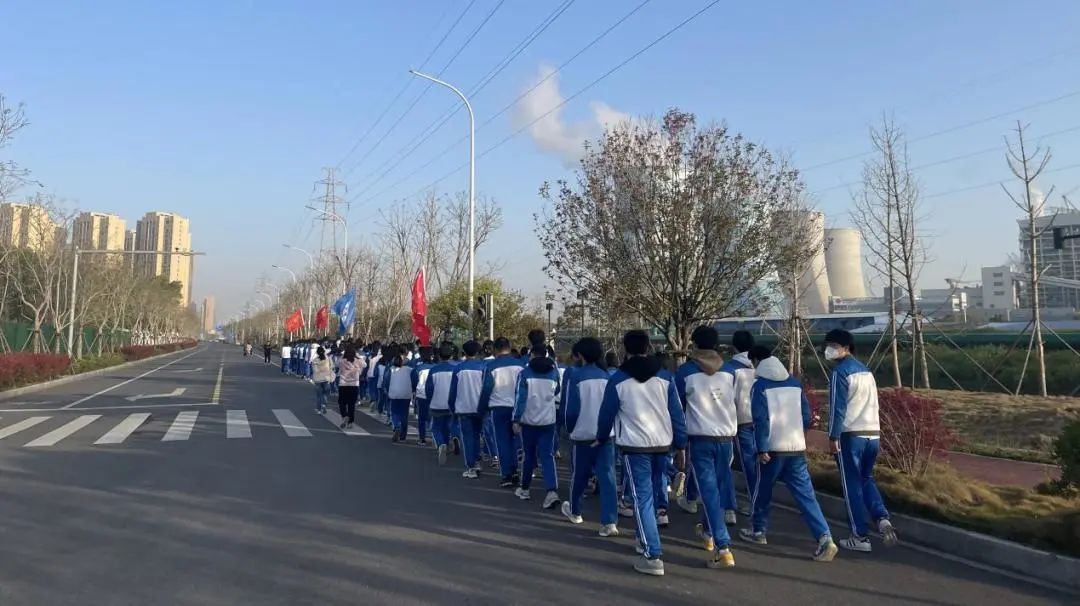 校团总支学生干部、2023年入团积极分子、教育管理学部幼儿保育专业2124班、2232班共计150余名师生组成的啦啦队志愿者方阵,在校团委向国伟、陈杨洁,教育管理学部班主任刘子杰、王鑫,四名老师带领下,排着整齐的队伍,迈着矫健的步伐从学校西门出发来到指定位置,为“荆马”健儿们进行志愿服务、加油助威。