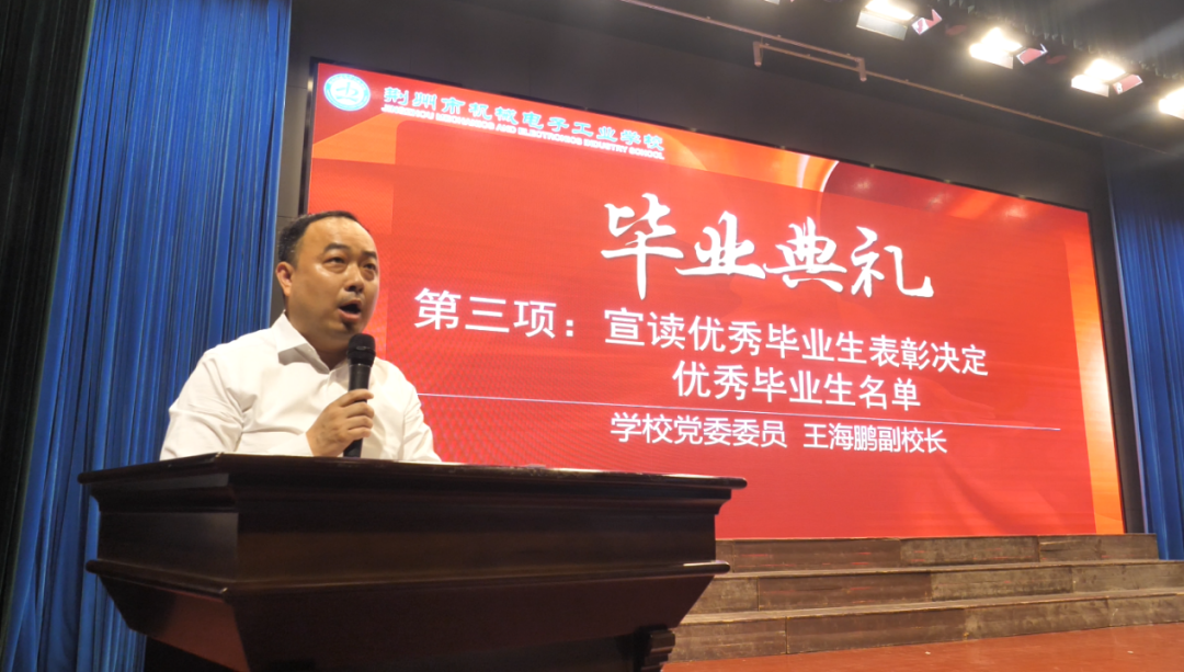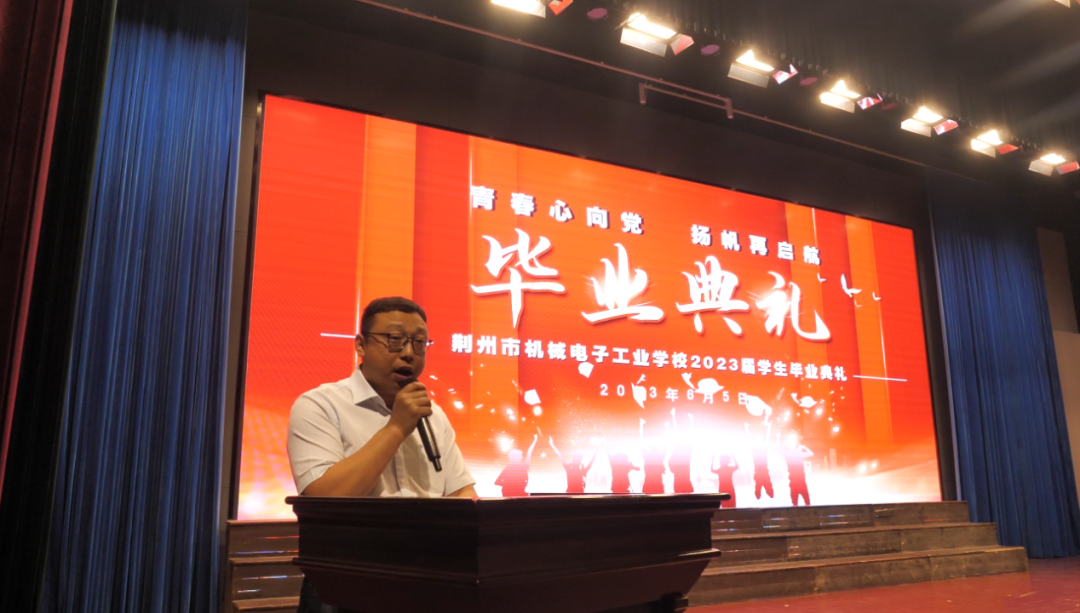 骊歌声起,别情依依。6月5日,荆州市机械电子工业学校2023届学生毕业典礼在报告厅隆重举行。党委副书记、校长李念军同志,党委委员、副校长陈剑同志,党委委员、纪委书记李卓慧同志,党委委员、副校长王海鹏同志,党委委员、副校长胡蓉蓉同志,各学部主任,有关职能部门负责人,教师代表和2023届毕业生参加典礼。学工科科长李晶晶同志主持典礼。