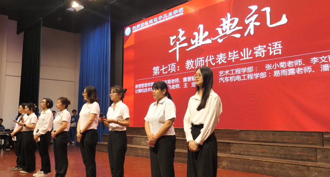教育管理学部丁庆菊老师、詹慧敏老师,计算机技术学部向燕飞老师、王定老师,艺术工程学部张小菊老师、李文菁老师,汽车机电工程学部易雨露老师、潘虹老师作为代表教师为寄语毕业生,送上离别的祝福。