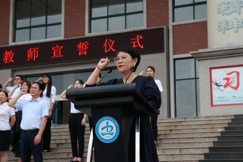 教师是知识的传播者,是文明的传承者,是塑造灵魂的工程师。为增强我校教师教书育人的责任感、使命感和荣誉感,开学典礼上,二十多位教师代表在主席台上面向国旗,庄严宣誓做学生的良师益友,铸教师高尚人格,为职教事业的发展,为国家繁荣和民族复兴努力奋斗!