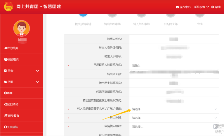 (3)进入此界面后,务必填好全部信息,部分个人信息系统已生成,必填常用联系人联系方式(填写自己)、转入组织是否为北京/广东/福建(一般填写“否”特殊情况根据个人情况填写)、转出原因(升学)和申请转入组织(录取院校)。