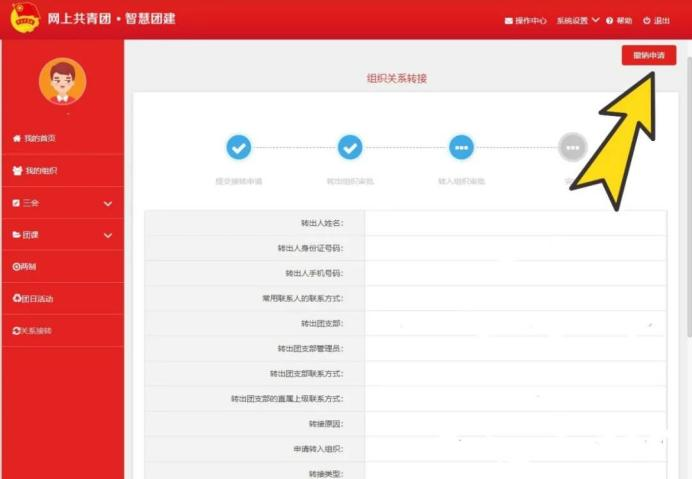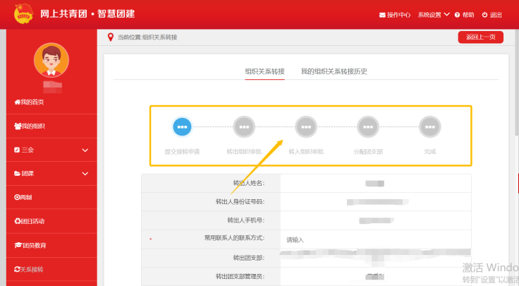 (5)申请成功后可通过此界面看到申请进度,若有问题请及时联系校团委或者转入院校。