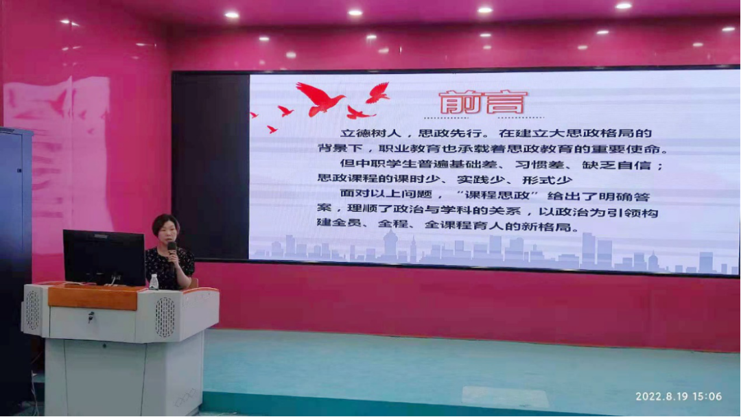 教务科副科长薛方在《中职“课程思政”建设与实践》的培训课中,让新入职教师看到不一样课程思政的思维,即思政教育不应该只是思想理论的灌输,更多的需要通过现实生活中的案例将文化自信、工匠精神、民族传承等思政元素与我们的课程融入一起,在潜移默化中形成课程思政的建设;文科教研室包亚伶在《如何建设一门中职“精品课”》培训课中,通过理论讲解与优质精品课视频展示,阐述精品课制作的要素以及贯穿的设计理念等。
