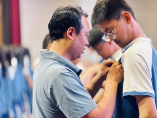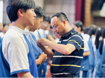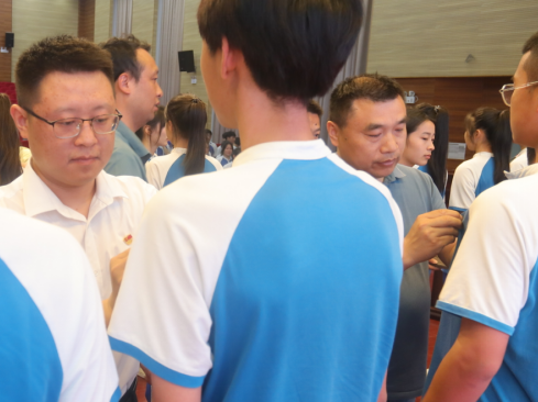 党员干部给新团员佩戴团徽