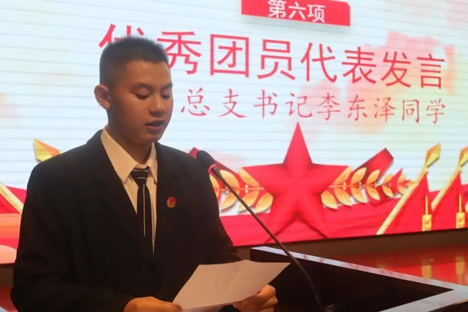 2022年度荆州市“优秀共青团员”、校团总支书记李东泽同学代表老团员发言。他表示作为一名老团员,自己在这个集体中成长了很多,收获了很多,也希望新老团员珍惜青春年华,勤奋学习,锐意进取,不骄不躁,不断增强自身的科学文化素养,不断提高自己的综合素质和各方面能力,争当当代青年的表率。