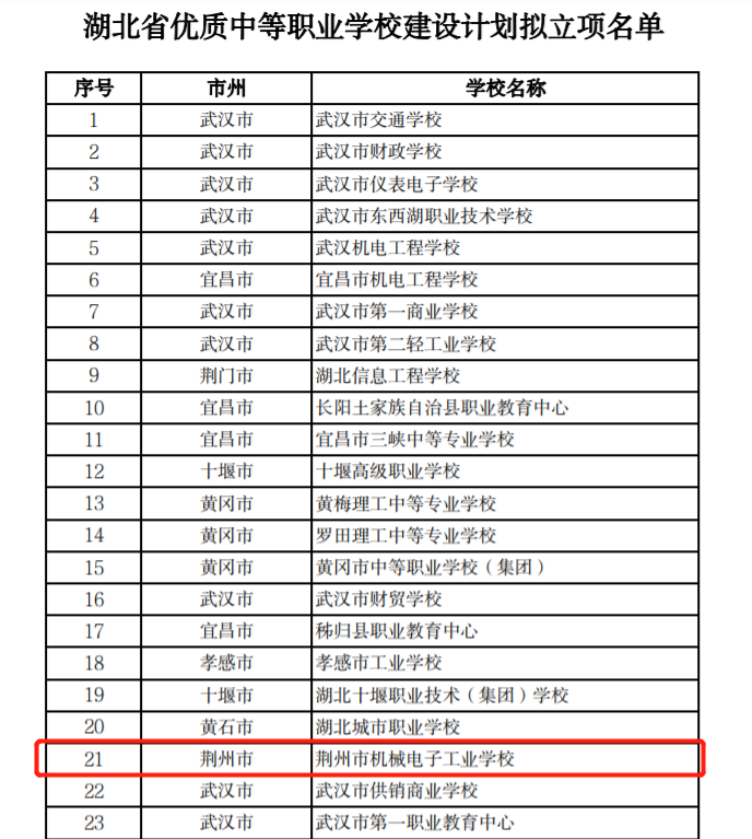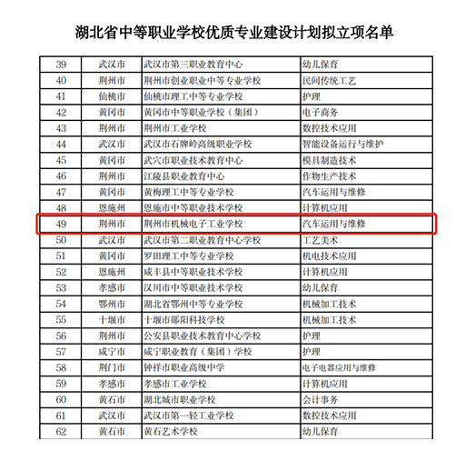 9月21日,湖北省教育厅公布了《湖北省中等职业学校优质专业建设计划拟立项名单》《湖北省优质中等职业学校建设计划拟立项名单》,全省拟立项优质中等职业学校70所,优质专业120个,我校以荆州市第一的成绩入选“优质学校”建设计划拟立项名单,位居全省前列,我校汽车运用与维修专业入围拟立项名单。