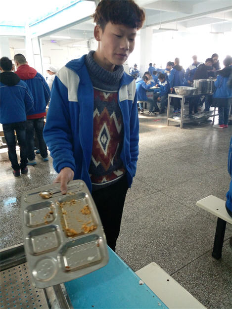 “谁知盘中餐,粒粒皆辛苦。我们不能忘记勤俭节约的传统美德,更不能忘记全国仍有1亿多贫困人口。勤俭节约是中华民族的传统美德,更是我们每一名中职学生应遵循的道德规范……”,“一粥一饭当思来之不易。勤俭不是吃苦,而是对有限资源的珍视。从今天午饭开始,让我们一起:不剩饭,不浪费!加入“光盘”族,一起对“浪费”说不!”昨日中午12时,学区二1502班学生在食堂二楼开展了“将光盘行动进行到底”的宣传活动,他们向前来打饭用餐的同学发出倡议,参与到“光盘”行动中来。食堂二楼入口处摆着写有“杜绝浪费”字样的海报,食堂墙上贴着手绘宣传图。