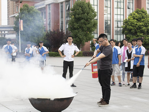 报告厅的讲解结束之后,大家来到科技楼前广场,兰教官向大家介绍了灭火器的工作原理,并通过灭火器将提、拉、握、压等操作步骤进行了详细的讲解与演示。为了使师生提高实际操作能力,还特意安排了教师代表和学生代表进行了灭火演练。