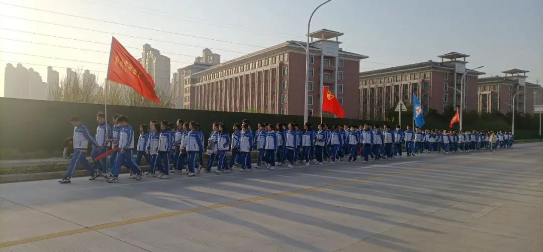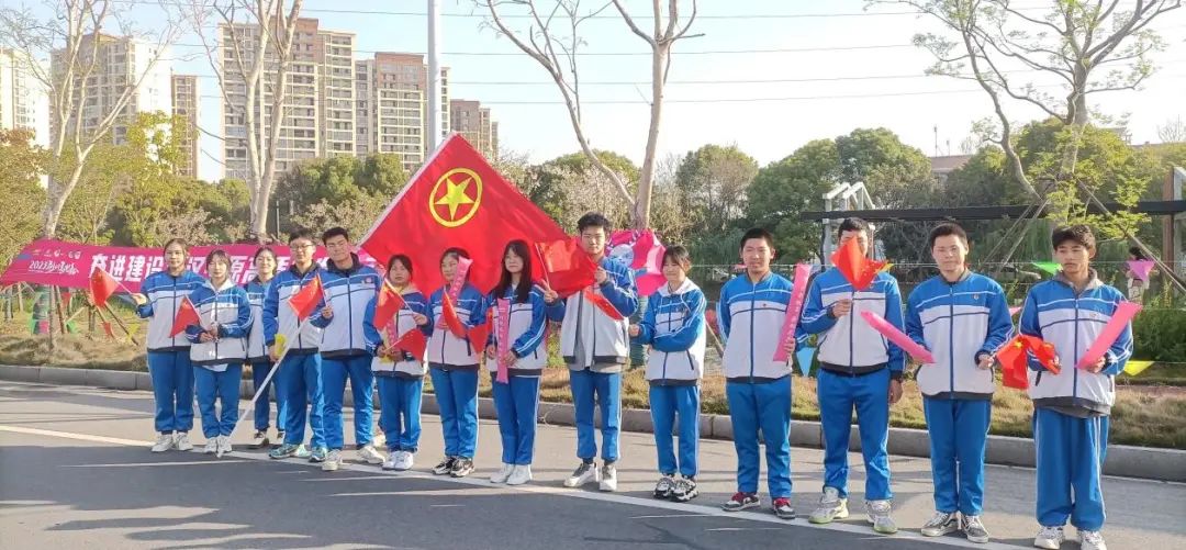 校团总支学生干部、2023年入团积极分子、教育管理学部幼儿保育专业2124班、2232班共计150余名师生组成的啦啦队志愿者方阵,在校团委向国伟、陈杨洁,教育管理学部班主任刘子杰、王鑫,四名老师带领下,排着整齐的队伍,迈着矫健的步伐从学校西门出发来到指定位置,为“荆马”健儿们进行志愿服务、加油助威。
