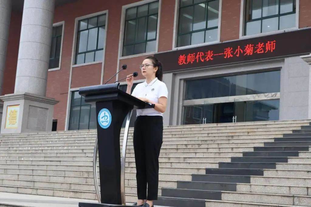 在师生代表发言环节,2329班幼儿保育专业的申彩宏同学代表1770名新生提前为全体教师送上教师节祝福,她表示要做“有信仰,守纪律,重责任”的中职生,记住“笃勤致能,搏行励新”的校训,并时刻用它来鞭策自己,让校训成为指路明灯。