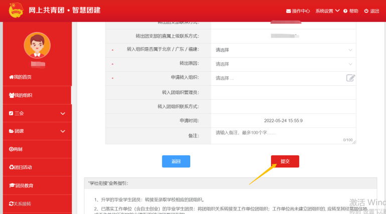 (3)进入此界面后,务必填好全部信息,部分个人信息系统已生成,必填常用联系人联系方式(填写自己)、转入组织是否为北京/广东/福建(一般填写“否”特殊情况根据个人情况填写)、转出原因(升学)和申请转入组织(录取院校)。